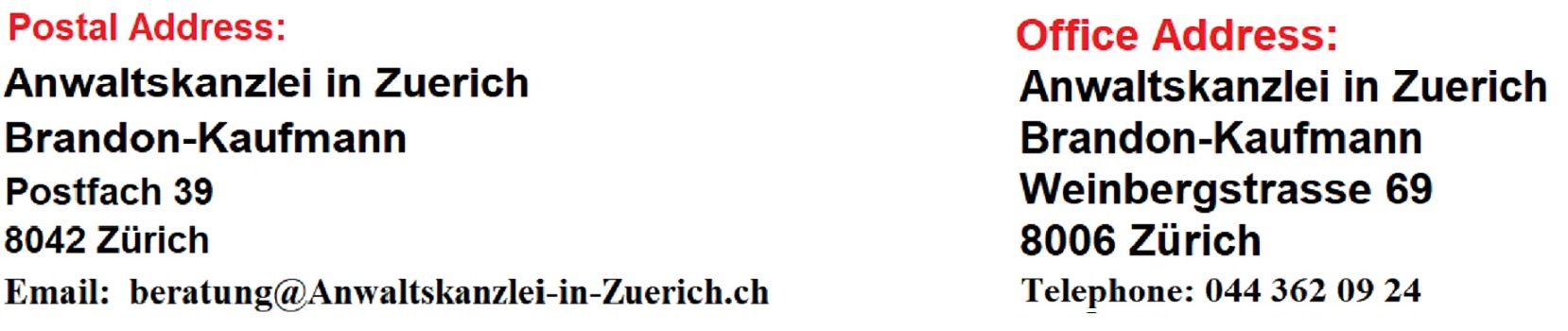 It is advisable to always contact “licensed” Swiss lawyers with years of training, experience, fluency in English and sufficient knowledge of Swiss & international law as well as approved by all authorities and courts of appeal in Switzerland. | Zurich, Basel, Bern, Zug, Geneva, Lausanne, St. Gallen, Winterthur, Luzern, Aargau, Schwyz etc. |